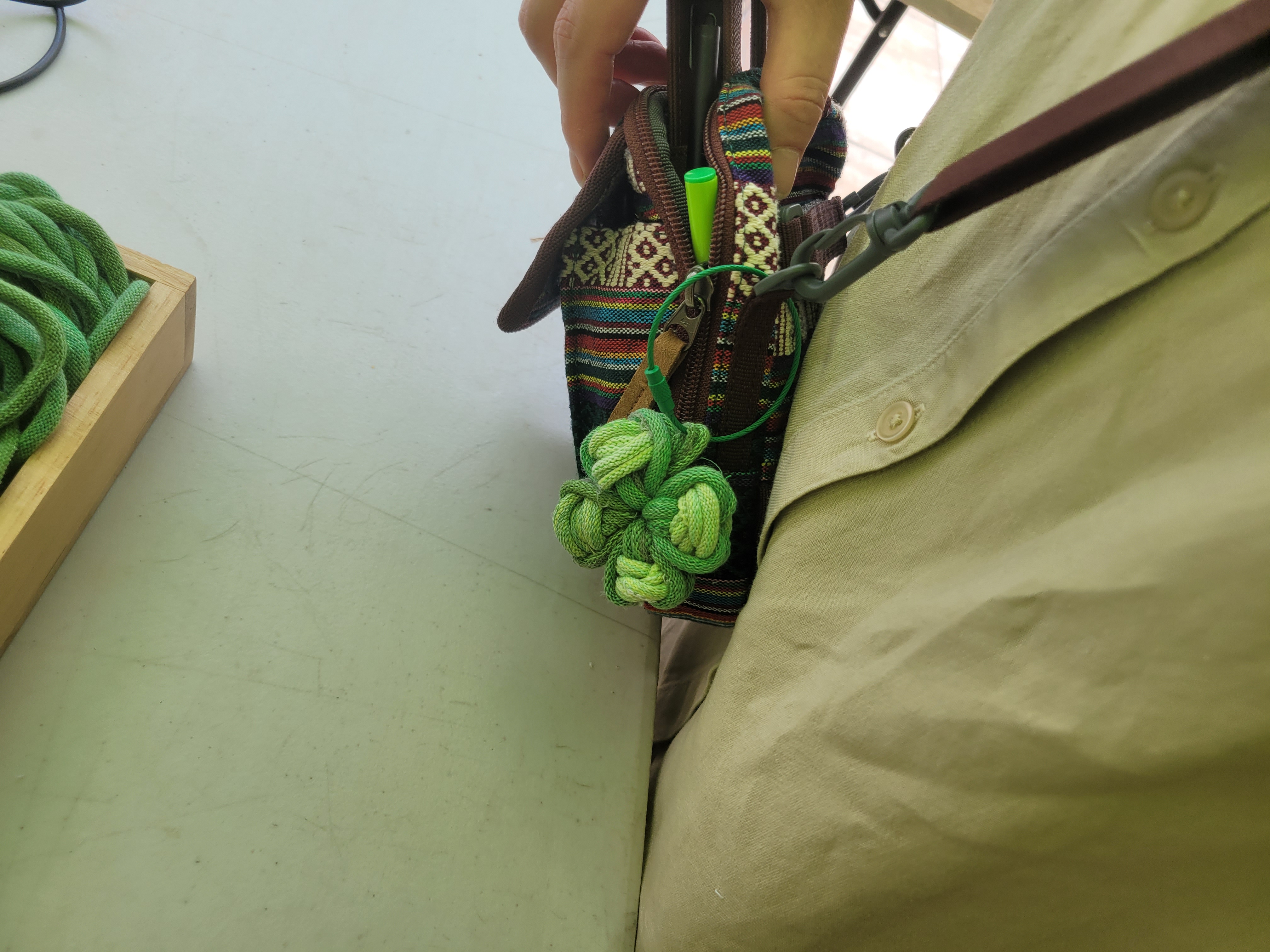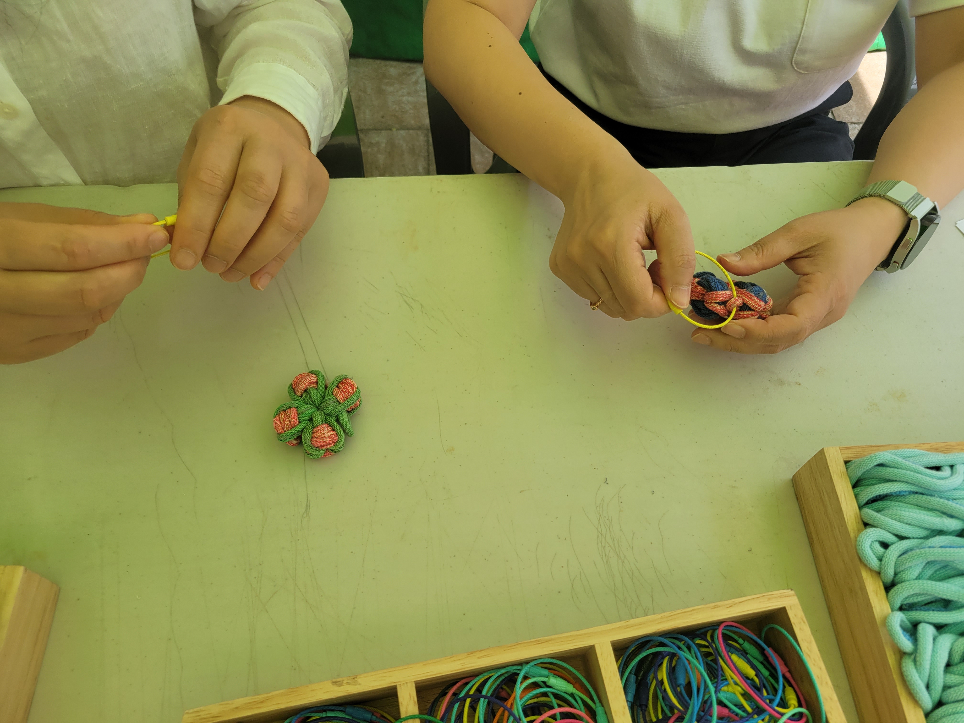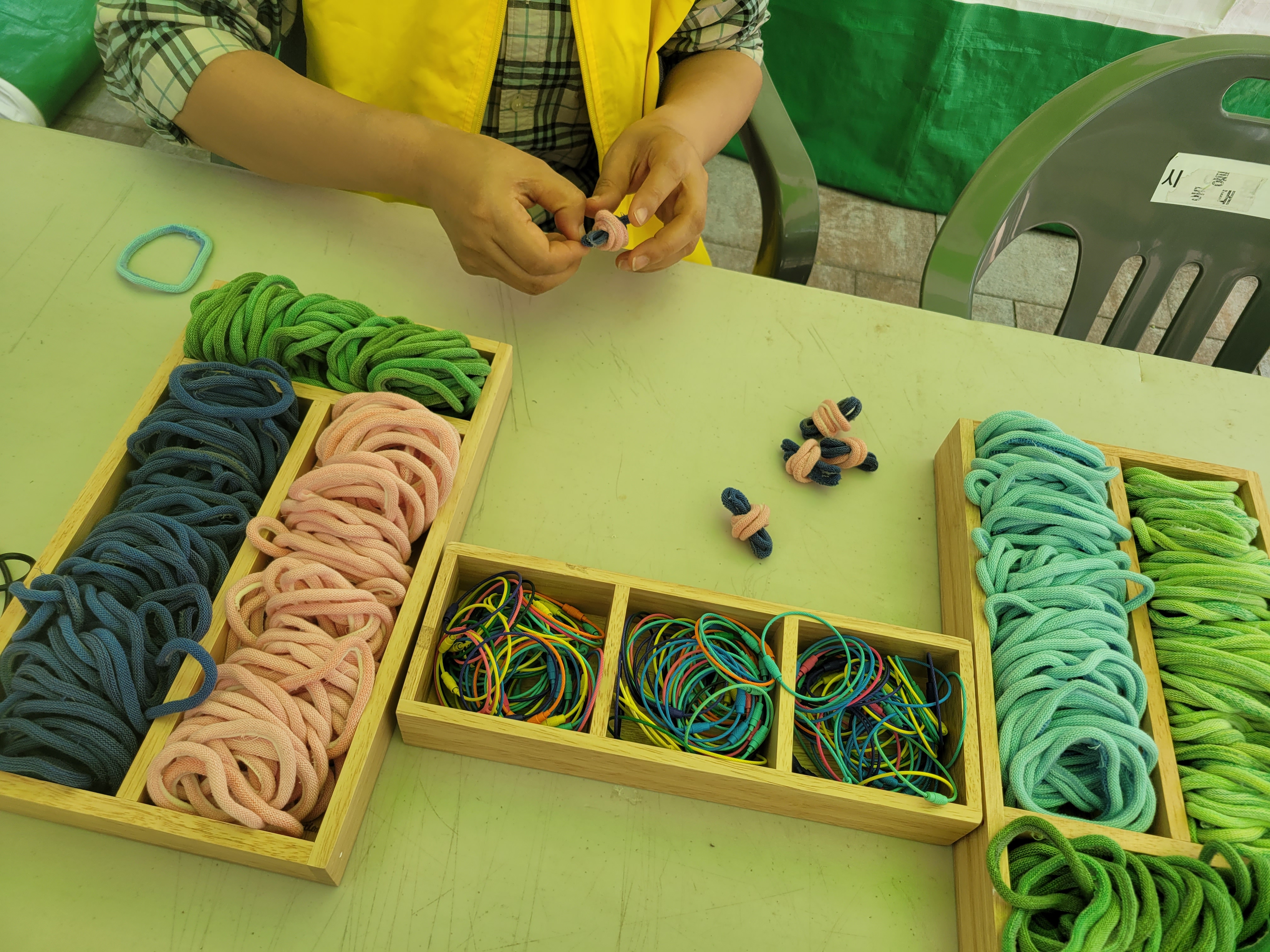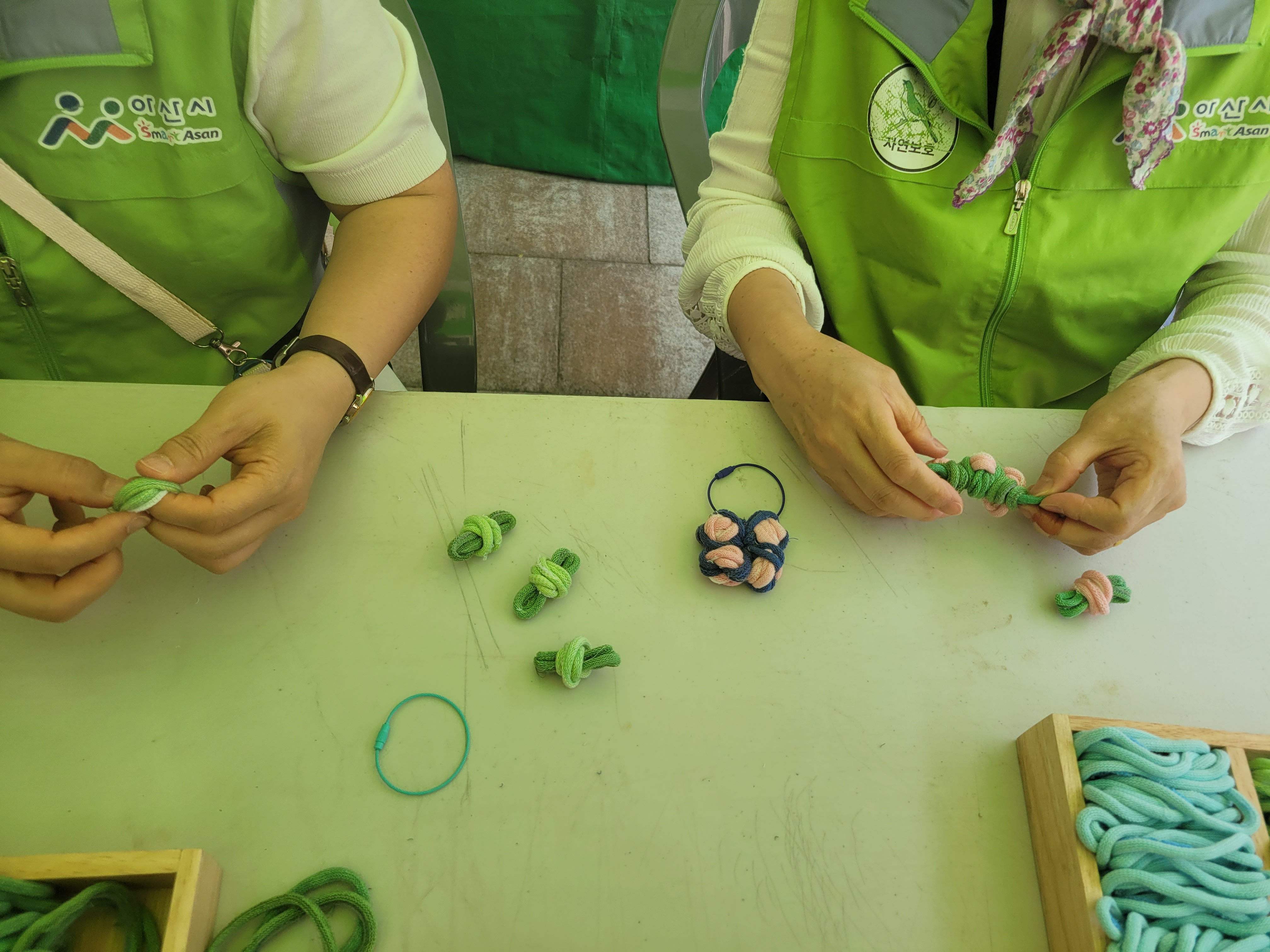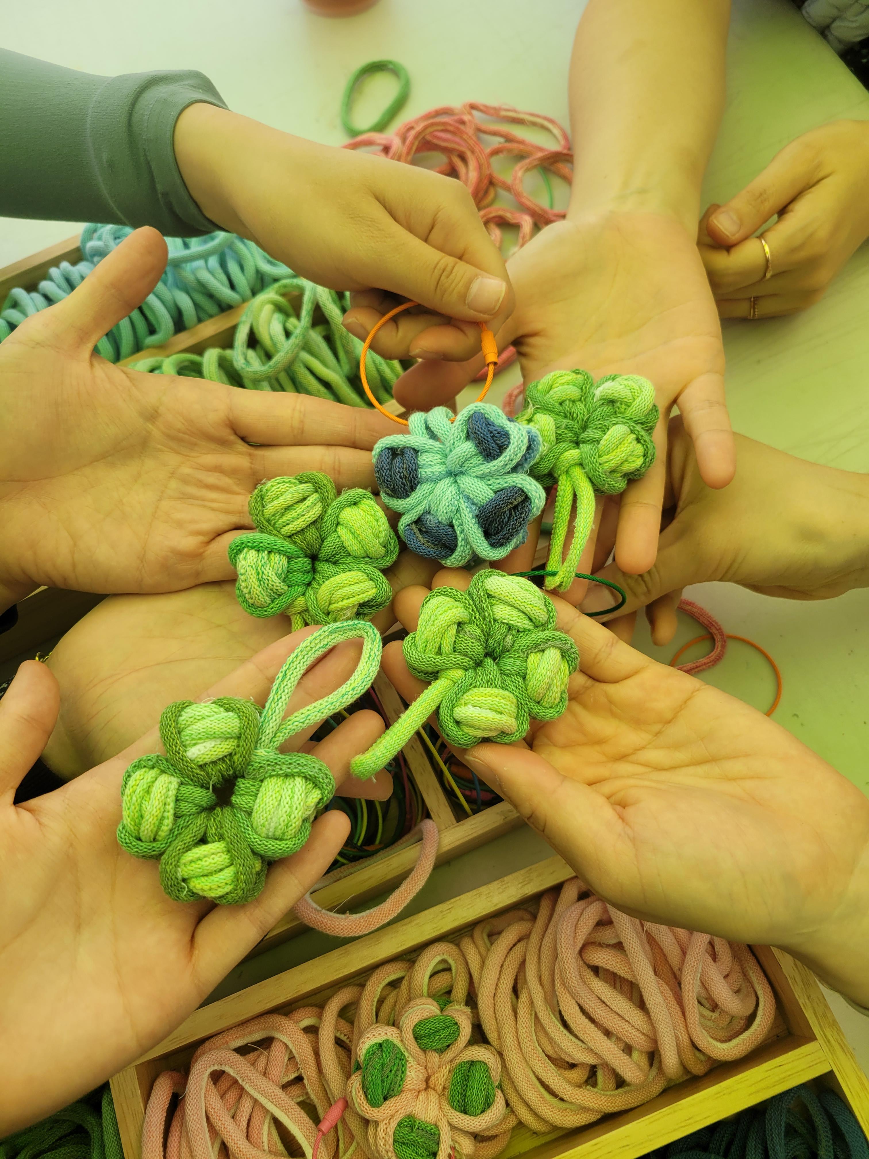 오월랑공방에서는 탄소는 행운의 네잎크로버에게 양보할께!라는 슬로건을 걸고 양말을 생산하며 어쩔 수 없이 생산되어 버려지는 산업폐기물인 봉주끈으로 네잎크로버 만들기를 진행했어요. 이 봉주끈이 우리의 방식대로 양말목이라는 이름을 얻어 새활용소재로 가장 많이 활용되는 것 중에 하나지요^^